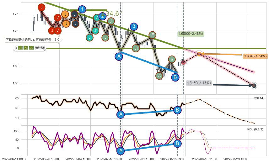 ➢ 预测:2022-08-16 12:00,【小幅反弹】稳定目前下跌趋势的前提下,预测价格:1.6348