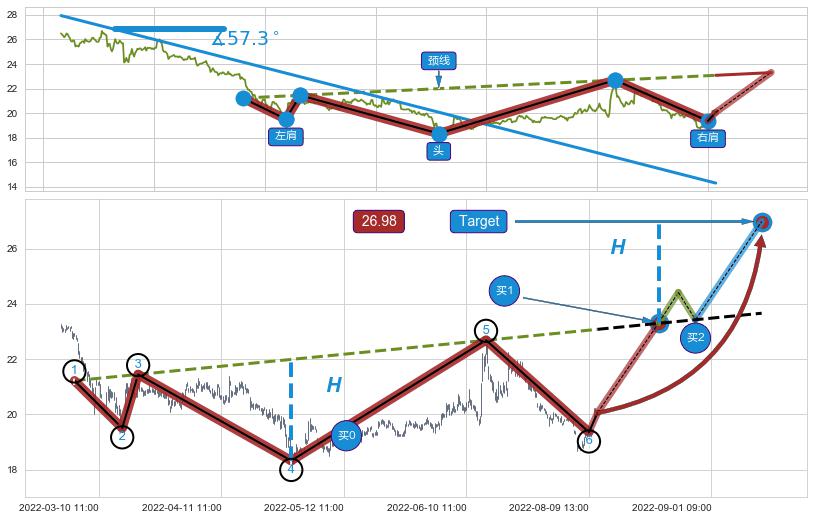 ➢ 头肩底:猜想临近关键阻力位突破点 → 临近拐点上涨 → 机会信号 → 大趋势均值回复