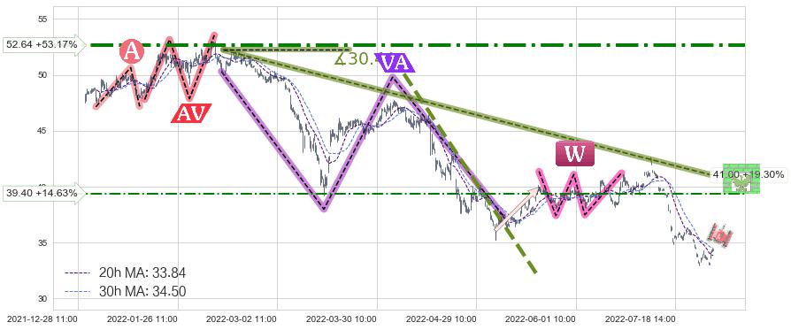♘ 在最后的下跌阶段2022-02-15 13:00至2022-08-12 14:00,存在 持续未破位的阻力位 ,阻力价格41.00,可信任强度82.18%,其距离最后价格34.37相差 +19.30%