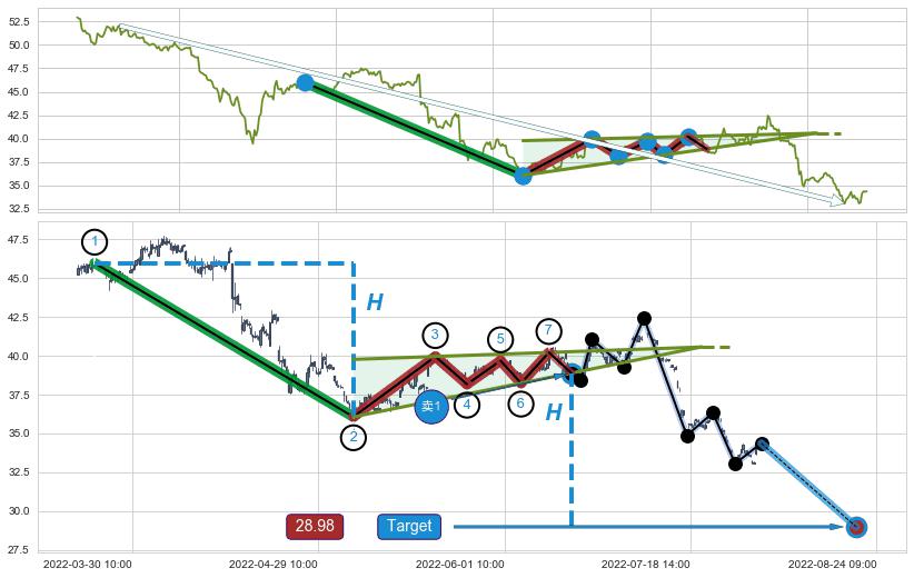 ➢ 最小中继整理跌幅→𝐇: 9.91 (𝐇楔型旗杆的长度:楔型起点→顶点)