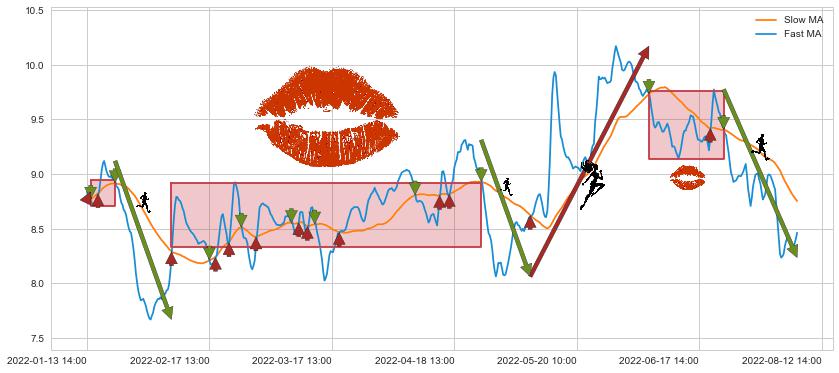 07-01 14:00至08-12 14:00 慢线与快线呈空头排列, 慢线与快线接触少,无缠绕