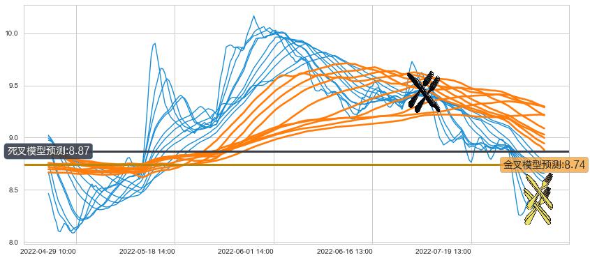 ➢ 55小时均线于(07-01 14:00: 9.40)形成【死叉】基于【死叉历史模型】预测死叉后最低波谷价格: 8.82, 死叉后最低价格8.14,已经下跌超出预测最低波谷价格, 预期反弹