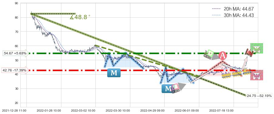 从2022-03-01 14:00至2022-06-01 13:00,共包含306个小时,阶段股价下跌-40.23%,阶段股价变动位移路程比: 1 : 7,下跌趋势角度: 49.9
