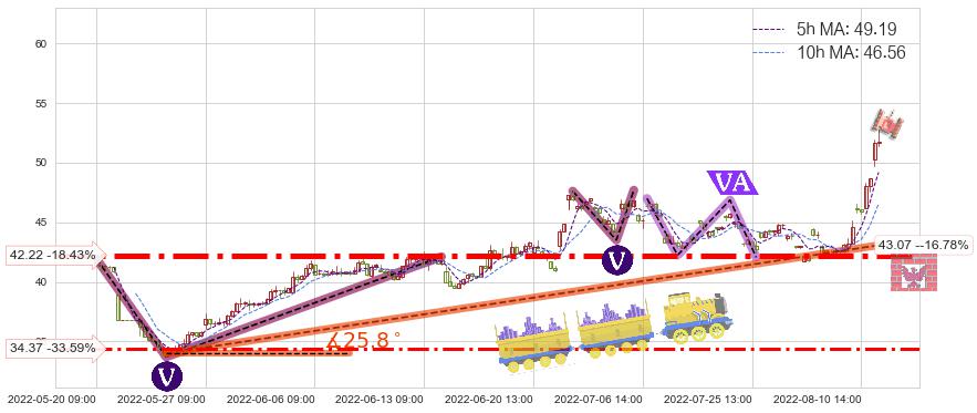 ♘ 在最后的上升阶段2022-05-25 10:00至2022-08-12 14:00存在 持续未破位的支撑位 ,支撑价格43.07,支撑可信任强度86.72%,其距离最后价格51.76相差 -16.78%