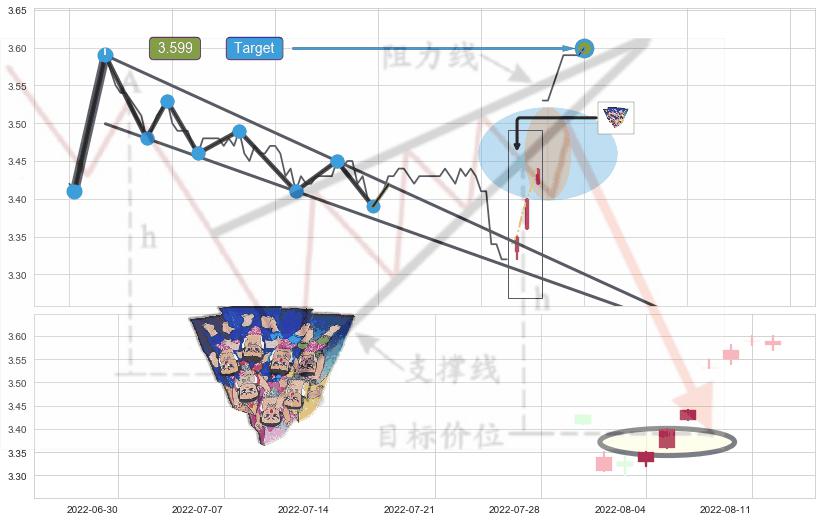 ♘ 支撑价格位3.538,可信任强度74.01%,距离最后交易2022-08-12 14:00形成的收盘价格3.590相差 -1.45%