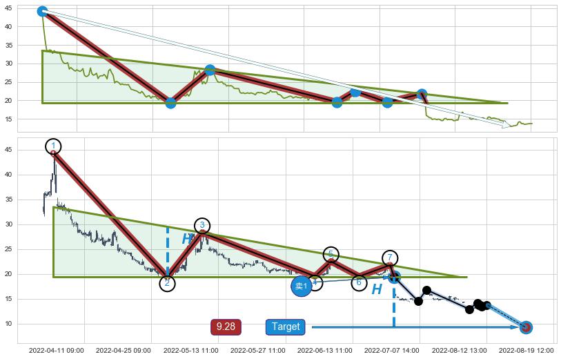 ➣ 最小中继整理跌幅→𝐇: 10.11 (下侧直角边第一支撑点②与斜边垂直距离)