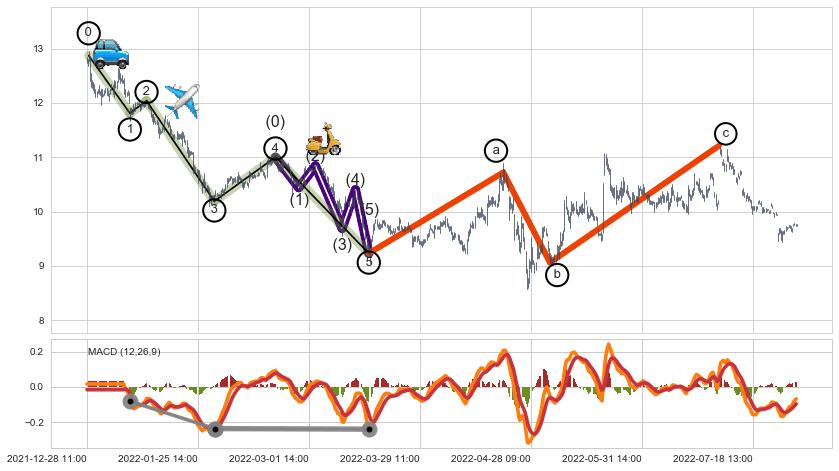 ➢ 波浪理论:猜想击穿突破c点后继续上涨 → 上涨 → 机会信号 → 小趋势跟踪