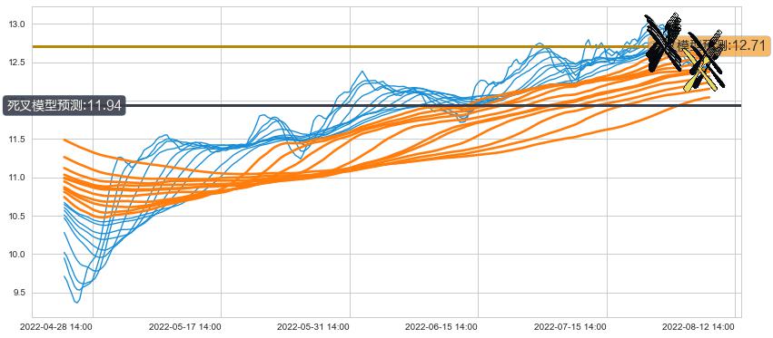 ➢ 5小时均线于(08-12 13:00: 12.44)形成【死叉】基于【死叉历史模型】预测死叉后最低波谷价格: 11.81, 死叉后最低价格12.47,已经下跌超出预测最低波谷价格, 预期反弹