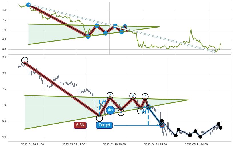 ➣ D点拟合预测价格7.47,距离最后交易收盘价格6.29相差 +18.74%