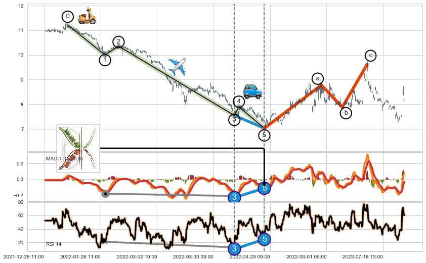 ➢ 波浪理论:猜想击穿突破c点后继续上涨 → 上涨 → 机会信号 → 小趋势跟踪