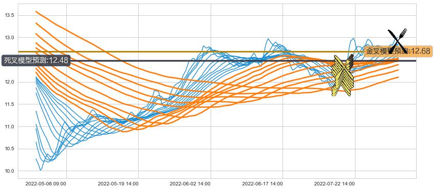 ➢ 13小时均线于(07-15 14:00: 11.95)形成【金叉】基于【金叉历史模型】预测金叉后最高波峰价格: 12.21, 金叉后最高价格13.29,已经上涨超出预测最高波峰价格, 预期回调