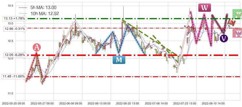 ♘ 阻力价格位13.13,可信任强度84.23%,距离最后交易2022-08-12 14:00形成的收盘价格12.90相差 +1.78%