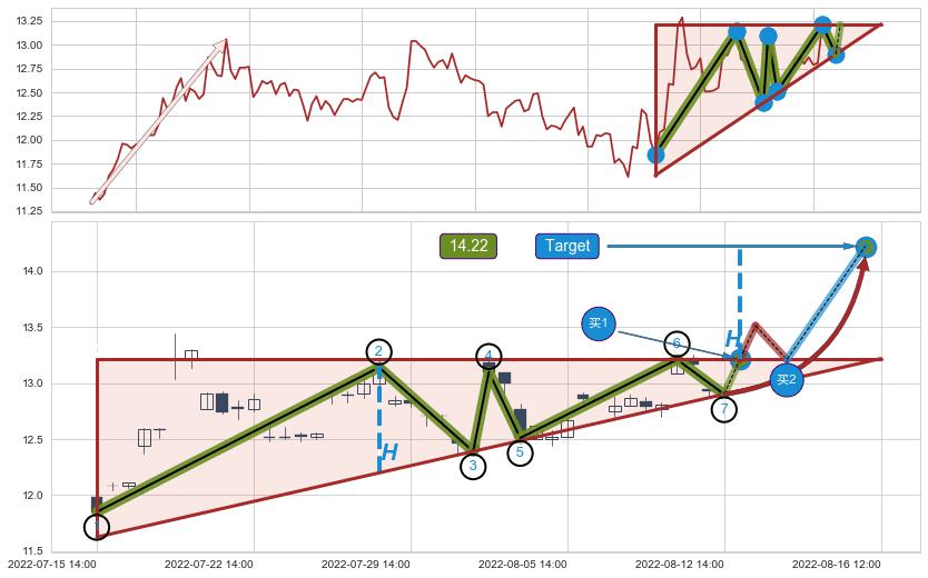 从2022-07-12 14:00至2022-07-20 14:00,共包含13个小时,阶段股价上涨13.86%,阶段股价变动位移路程比: 1 : 1.6,2022-07-20 13:00向⇪形成缺口,跳空上涨+4.93%
