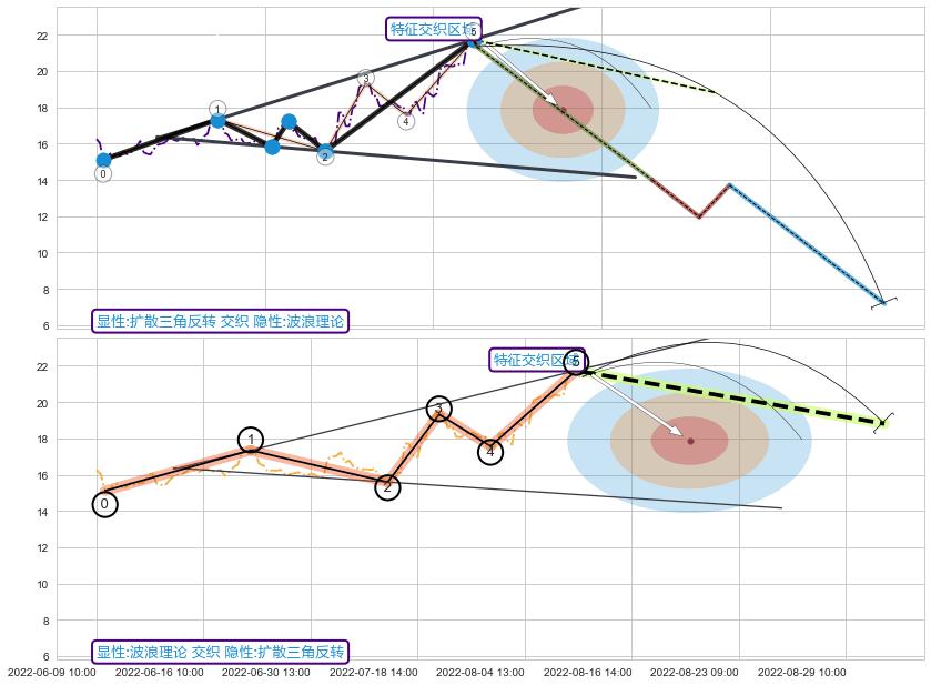 ➢ 波浪理论上涨浪:浪5回调拐点 🔜 扩散三角反转临近支撑猜想转换阻力下跌 综合量化分数:44.10 【偏空】