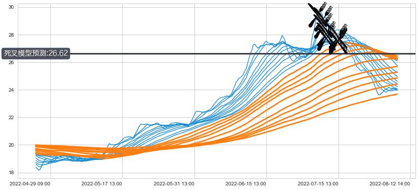➣ 30小时均线于(07-14 14:00: 27.81)形成【死叉】基于【死叉历史模型】预测死叉后最低波谷价格: 26.63, 死叉后最低价格23.20,已经下跌超出预测最低波谷价格, 预期反弹