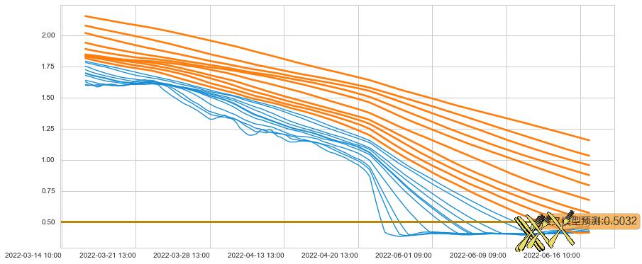 ➣ 70小时均线于(06-14 14:00: 0.44743)形成【金叉】基于【金叉历史模型】预测金叉后最高波峰价格: 0.5579, 金叉后最高价格0.5000,尚未达到预测最高波峰价格, 预期继续上涨