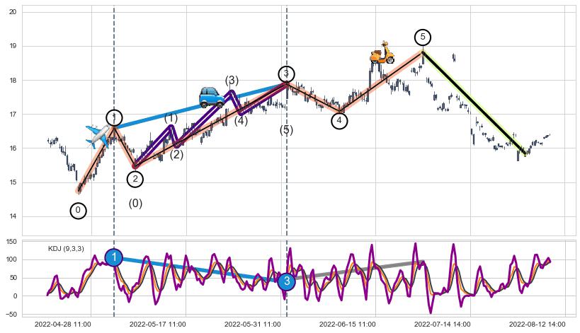 从2022-01-25 14:00至2022-02-28 09:00,共包含92个小时,阶段股价下跌-5.29%,阶段股价变动位移路程比: 1 : 5