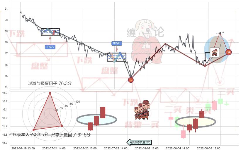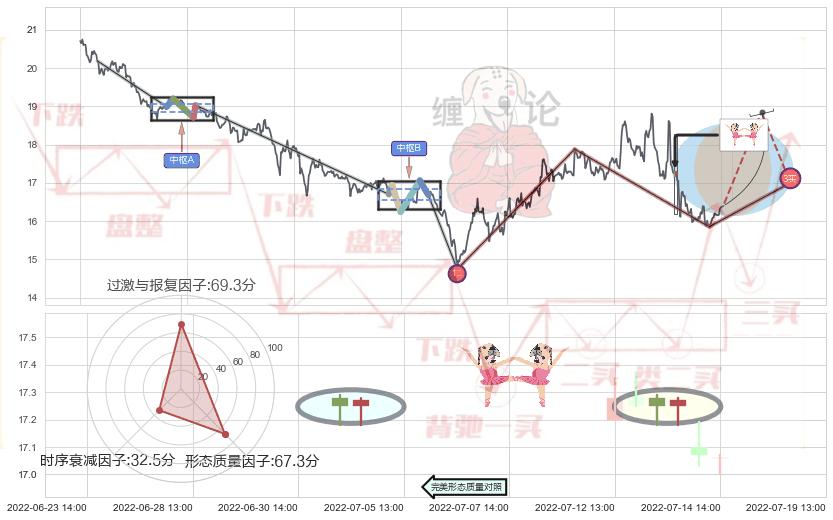 ➣ 【中枢B】:04-08:10-04-19:13,中枢由5笔构成,共38交易小时, ZG=16.94, ZD=16.70