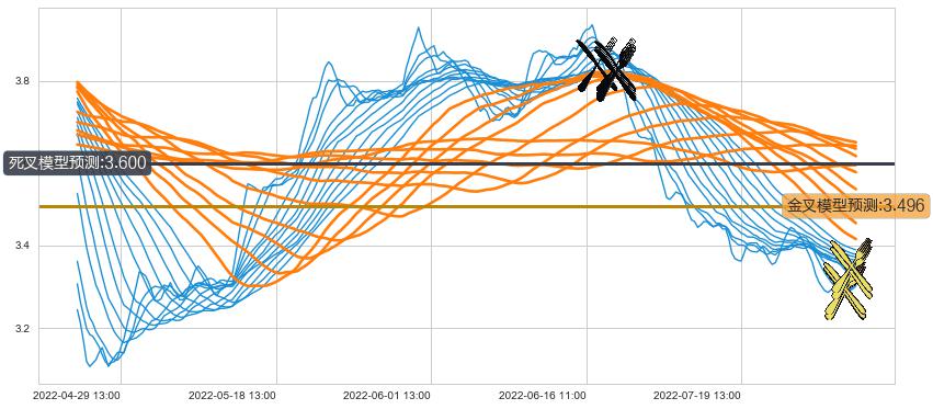 ➣ 40小时均线于(06-20 14:00: 3.834)形成【死叉】基于【死叉历史模型】预测死叉后最低波谷价格: 3.637, 死叉后最低价格3.260,已经下跌超出预测最低波谷价格, 预期反弹