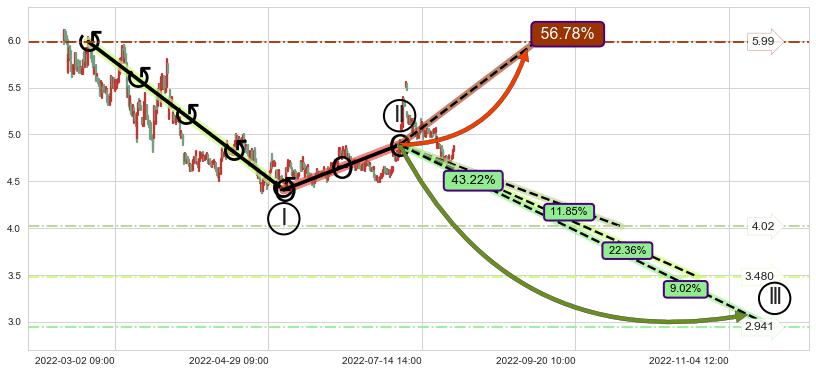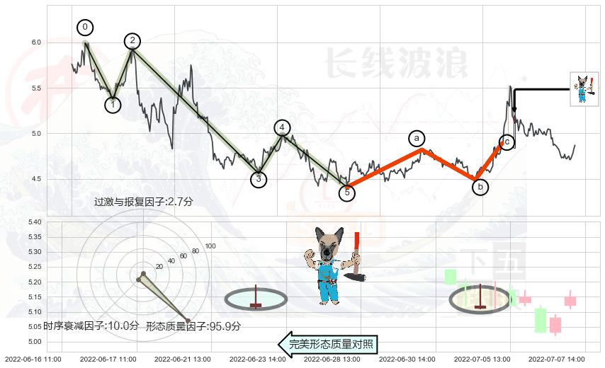 ➣ 调整浪已超过预测的c点位置,但后续大趋势循环浪高概率反转上涨,继续下跌概率43.22%,谨慎做空