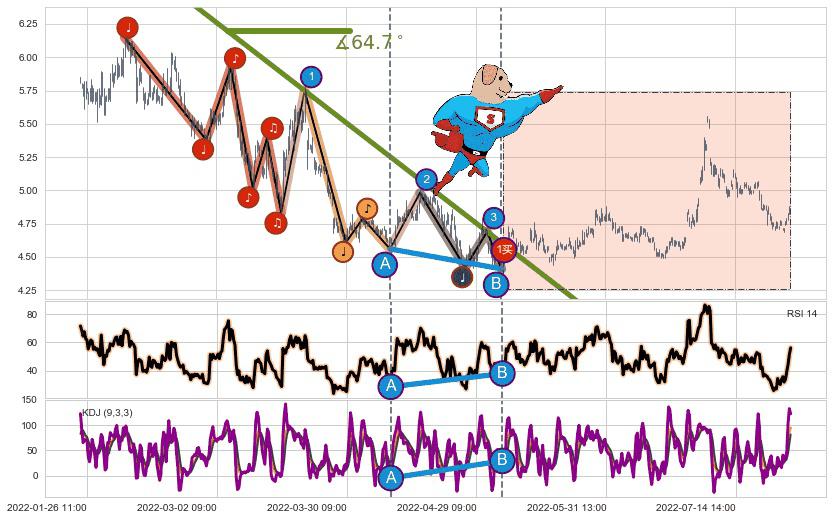 从2022-02-10 10:00至2022-05-30 09:00,共包含364个小时,阶段股价下跌-21.34%,阶段股价变动位移路程比: 1 : 15,下跌趋势角度: 64.7