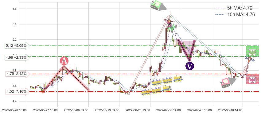 ♘ 阻力价格位4.98,可信任强度43.12%,距离最后交易2022-08-12 14:00形成的收盘价格4.87相差 +2.33%