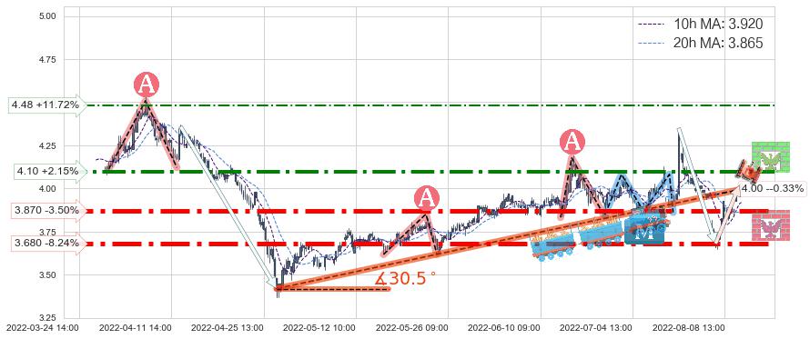 ♘ 阻力价格位4.48,可信任强度53.81%,距离最后交易2022-08-12 14:00形成的收盘价格4.01相差 +11.72%