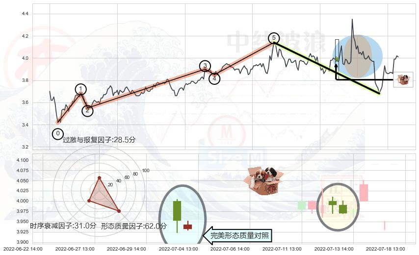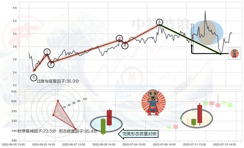 从2022-06-22 14:00至2022-07-19 13:00,共包含38个小时,阶段股价上涨1.77%,阶段股价变动位移路程比: 1 : 16