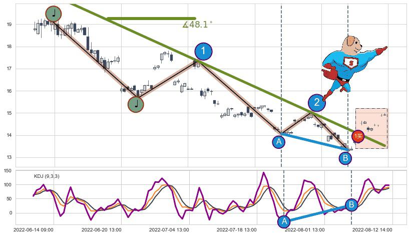 从2022-06-13 14:00至2022-08-12 13:00,共包含100个小时,阶段股价下跌-22.72%,阶段股价变动位移路程比: 1 : 6,下跌趋势角度: 48.1