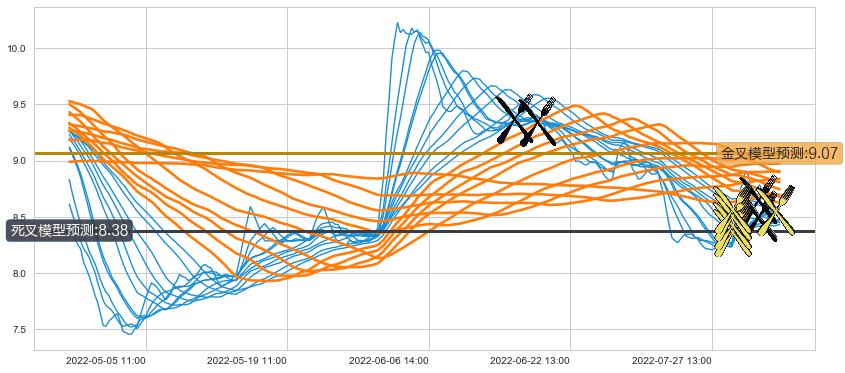 ➢ 13小时均线于(08-08 14:00: 8.64)形成【死叉】基于【死叉历史模型】预测死叉后最低波谷价格: 8.45, 死叉后最低价格8.40,已经下跌超出预测最低波谷价格, 预期反弹