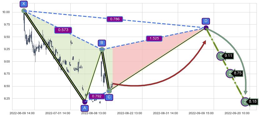 ➣ 谐波伽利:b下跌接近c:猜想支撑性拉升 → 上涨 →【拐点】支撑临近 → 大趋势均值回复