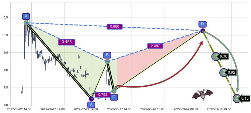 ➣ 谐波蝙蝠:b下跌接近c:猜想支撑性拉升 → 上涨 →【拐点】支撑临近 → 大趋势均值回复
