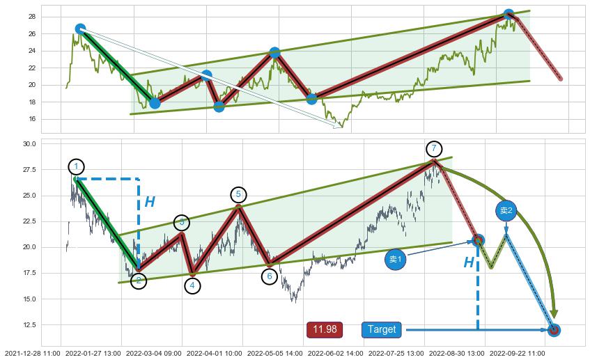 ➣ 升旗形:猜想临近关键支撑位突破点 → 临近拐点下跌 → 风险信号 → 大趋势均值回复