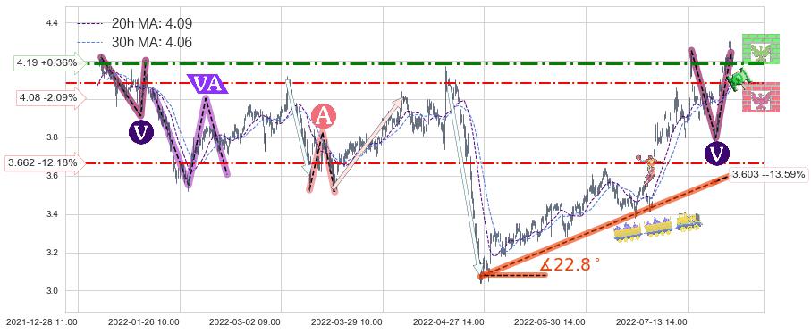 ♘ 阻力价格位4.19,可信任强度60.19%,距离最后交易2022-08-12 14:00形成的收盘价格4.17相差 +0.36%
