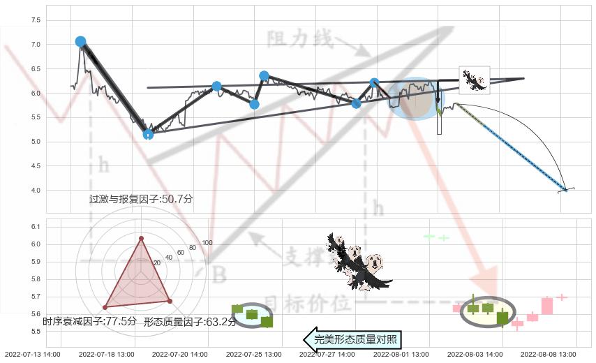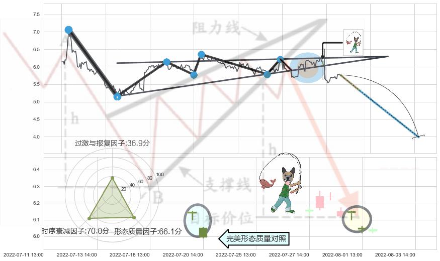 从2022-07-18 14:00至2022-08-12 14:00,共包含39个小时,阶段股价下跌-6.52%,阶段股价变动位移路程比: 1 : 4,2022-08-02 13:00向↘︎形成缺口,跳空下跌-6.30%˚