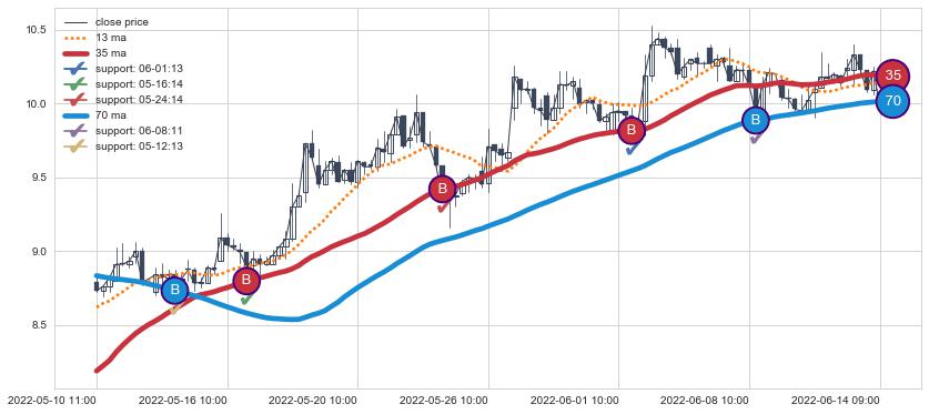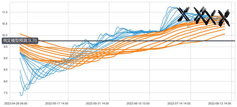 ➣ 70小时均线于(08-01 14:00: 10.79)形成【死叉】基于【死叉历史模型】预测死叉后最低波谷价格: 9.21, 死叉后最低价格10.34,尚未达到预测最低波谷价格, 预期继续下跌