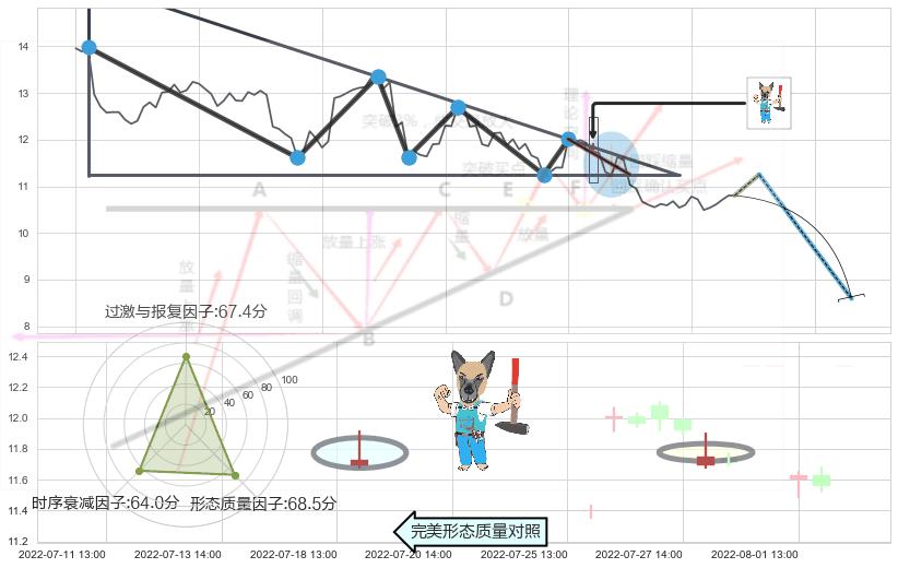 从2022-04-15 10:00至2022-08-12 14:00,共包含288个小时,阶段股价下跌-26.17%,阶段股价变动位移路程比: 1 : 13,下跌趋势角度: 15.7,2022-07-06 13:00向↘︎形成缺口,跳空下跌-7.18%˚
