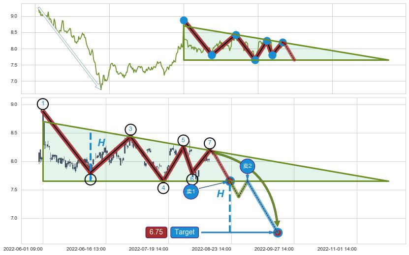 ➣ 【阻力】空方的卖盘使高点阻力位【③⑤⑦】逐步降低 构成三角的倾斜下降阻力斜边