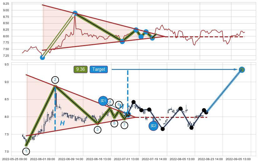 ➣ 【买2】: 保守型 买点 →(07-11:14: 7.99 )形成上升【对称】三角形整理突破后的【回抽确认】