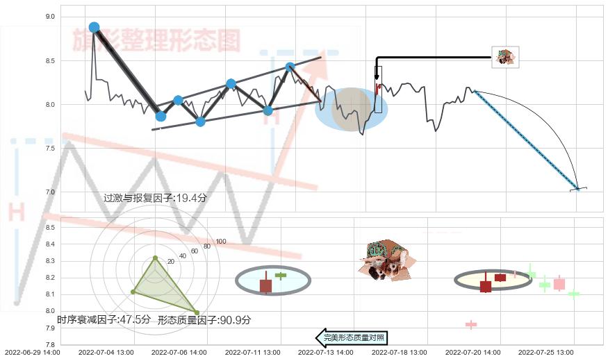 ➢ 顶部尽头线(下山虎) + 升旗形支撑破位转换阻力下跌信号叠加后【反向回撤率】中等,【看空】信号叠加【存续影响中等】