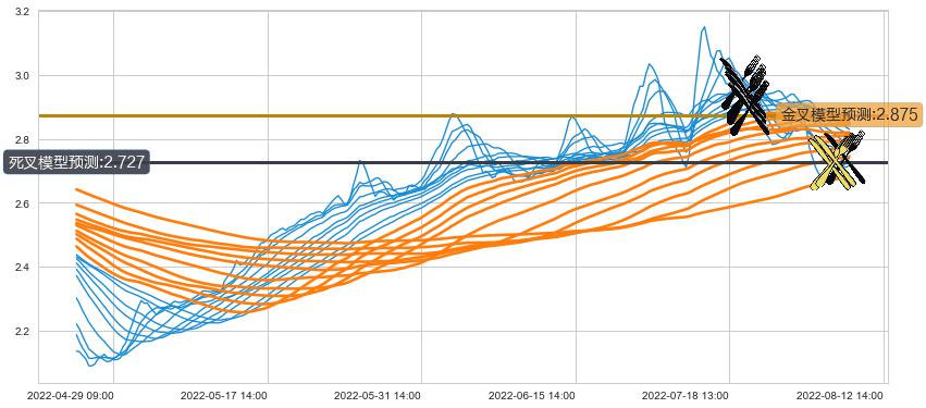 ➢ 10小时均线于(08-09 13:00: 2.721)形成【金叉】基于【金叉历史模型】预测金叉后最高波峰价格: 2.834, 金叉后最高价格2.760,尚未达到预测最高波峰价格, 预期继续上涨