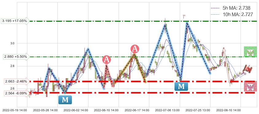 ♘ 阻力价格位3.195,可信任强度59.69%,距离最后交易2022-08-12 14:00形成的收盘价格2.730相差 +17.05%