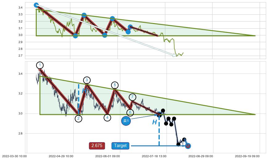 ➣ 最小中继整理跌幅→𝐇: 0.31500 (下侧直角边第一支撑点②与斜边垂直距离)