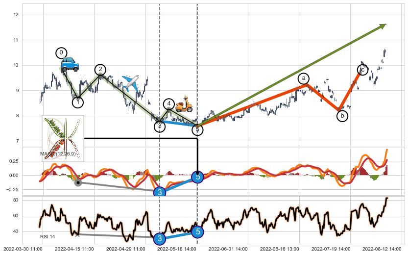 从2022-05-19 09:00至2022-05-24 14:00,共包含20个小时,阶段股价上涨2.70%,阶段股价变动位移路程比: 1 : 5