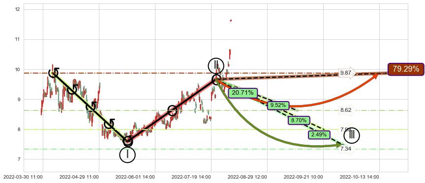 ♘ 支撑价格位9.66,可信任强度80.63%,距离最后交易2022-08-12 14:00形成的收盘价格11.63相差 -16.96%