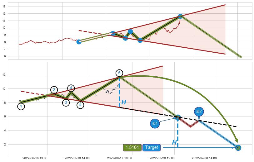 ➢ 最小反转跌幅→𝐇: 4.34 (逐步抬高阻力斜边最后的阻力点⑥与支撑边垂直距离)