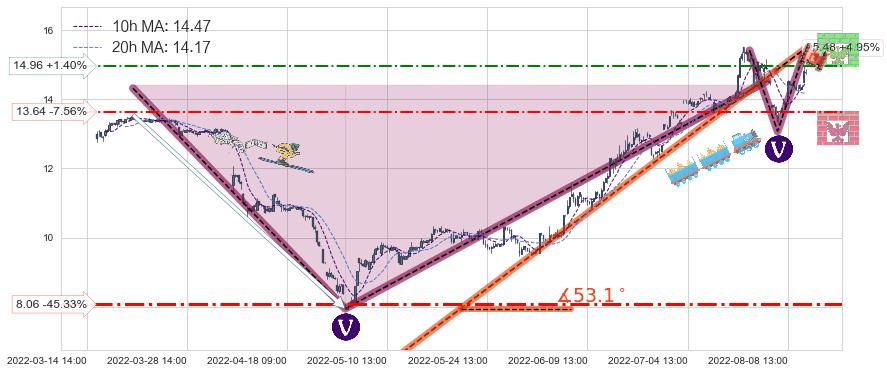 ♘ 阻力价格位14.96,可信任强度53.54%,距离最后交易2022-08-12 14:00形成的收盘价格14.75相差 +1.40%