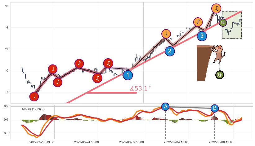 从2022-04-27 09:00至2022-08-03 13:00,共包含216个小时,阶段股价上涨56.12%,阶段股价变动位移路程比: 1 : 3,上涨趋势角度: 53.1
