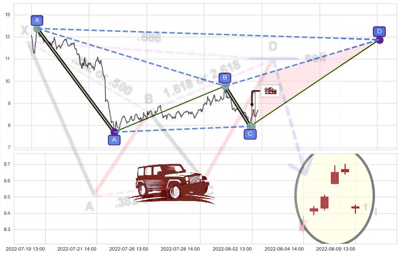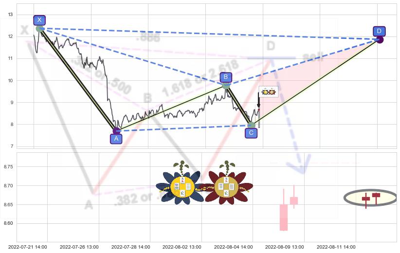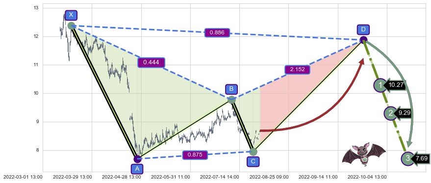 ➢ 谐波蝙蝠:b下跌接近c:猜想支撑性拉升 → 上涨 →【拐点】支撑临近 → 大趋势均值回复