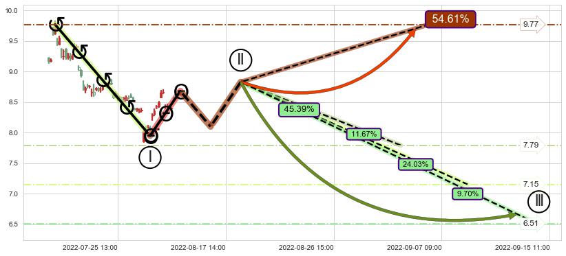 ➢ 循环浪继续向下【最低】位置(09-15:11, 6.51),匹配聚类样本比例21.36%, 可能性概率9.70%